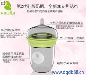 硅膠是一種材料,是一種能讓歐美等國(guó)家非常喜愛(ài)的材料,因?yàn)樵絹?lái)越多的產(chǎn)品開(kāi)始選擇用這樣的材料開(kāi)始生產(chǎn),比如說(shuō)硅膠奶瓶;硅膠奶嘴;圍兜等,最近就有一款新上市的奶瓶“partita” 這款產(chǎn)品是純硅膠打造,瓶身是高透明硅膠材質(zhì),瓶蓋和奶頭也是硅膠透明材質(zhì),從上倒下,看起來(lái)更像是一個(gè)可愛(ài)的寶寶,既然是高透明的硅膠生產(chǎn),那么產(chǎn)品100%是過(guò)食品級(jí)FDA認(rèn)證,不管是經(jīng)過(guò)多少度的高溫開(kāi)水,都不會(huì)釋放出有害物質(zhì),這款硅膠奶瓶是由加拿大布迪家居開(kāi)發(fā)生產(chǎn)。從硅膠本身的特性來(lái)說(shuō),硅膠是一種無(wú)色;無(wú)味;無(wú)毒的天然合成物質(zhì)。